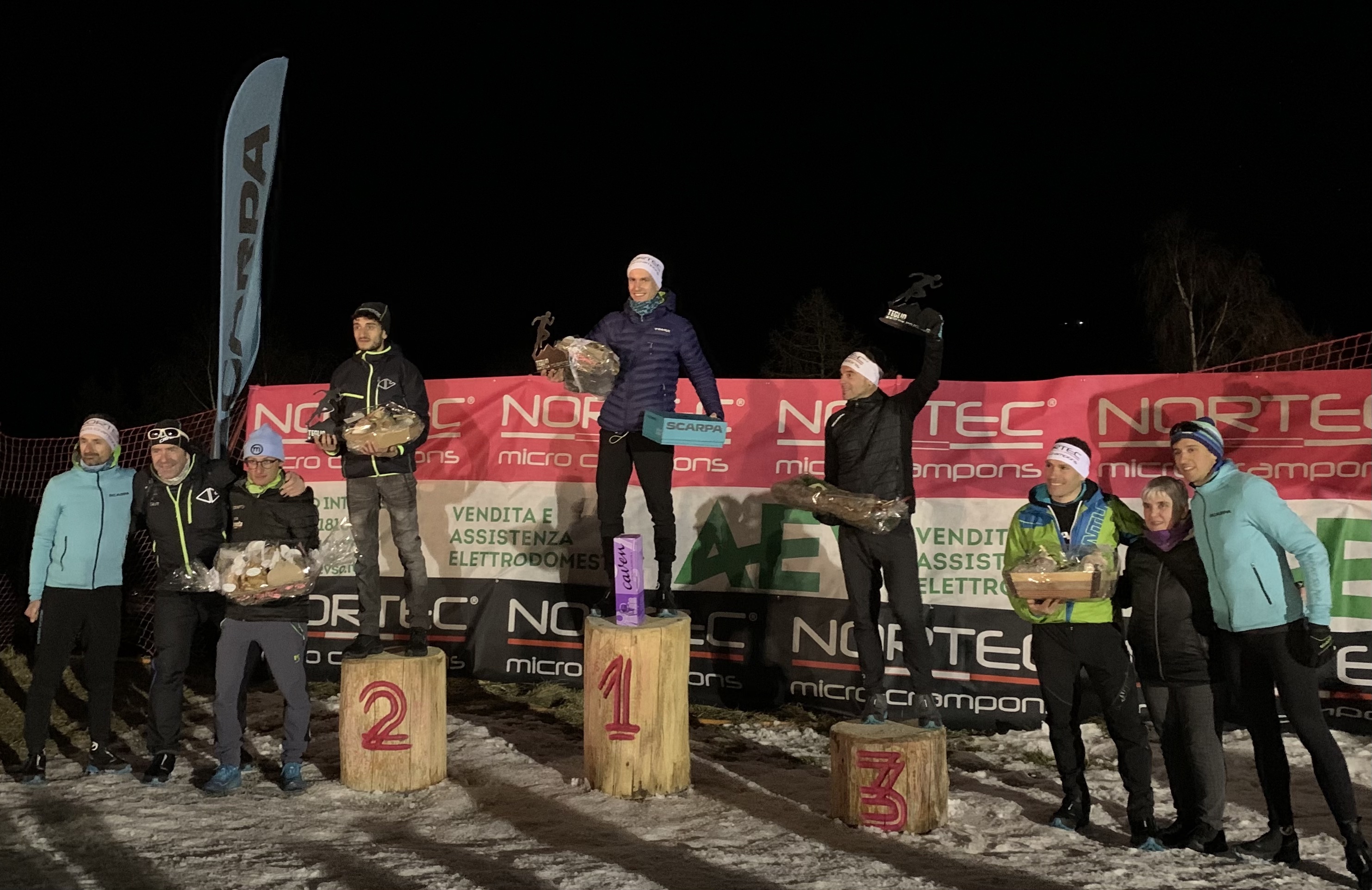 Dopo serata con meraviglioso tramonto, DJ set e Vin Brûlé, podio gelato col nostro Sky Lario Runner Luca Del Pero sul gradino più alto. Infine cena con pizzoccheri, bresaola, pan di segale, mele della Valtellina e bisciola.