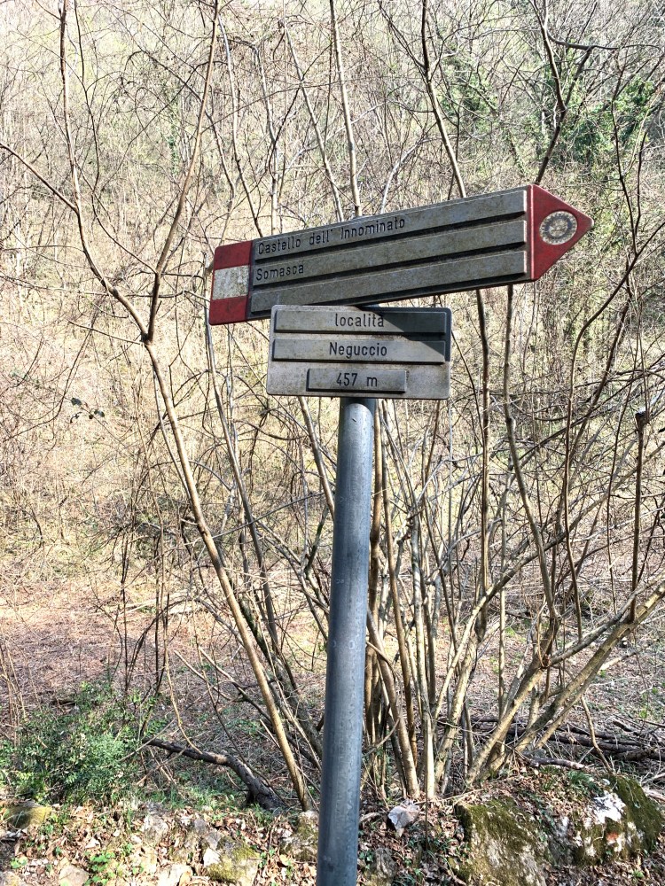 Al km 2 si trova il primo dei tabelloni che indicano la via da seguire: si abbandona il sentiero per seguire la strada sterrata usata dai mezzi che raggiungono le cave della zona fino ad incrociare il sentiero Rotary (la traccia tra Somasca e Versasio), che andrà seguito superando un ponticello. Si giunge ad una spianata con un verde prato dominato da una deliziosa casetta. Svoltando a destra e attraversata la piana, si entra nella gola di Neguggio, che conduce a delle case, appena oltre le quali, svoltando a destra, si prende la mulattiera che porta verso la fontana Marietta e l’agriturismo Ponte tenaglia. Qui si deve svoltare nuovamente a destra in modo secco per ritornare a salire verso il segnavia del km 4.