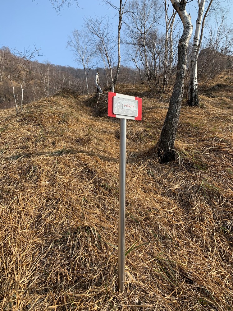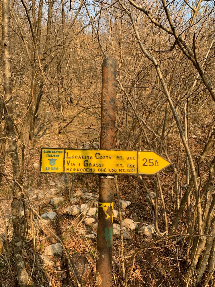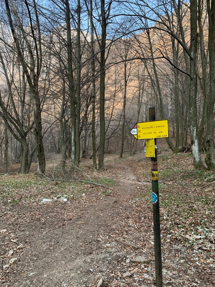 E qui la salita si fa subito ripida, per ricordare a chi vuole proseguire che 1000 m di dislivello in 6km non sono un vertical ma di certo nemmeno una tranquilla passeggiata. Il cartello caduta massi ci ricorda quanto siano fragili i nostri territori e quanta attenzione dobbiamo porre nel percorrerne i sentieri.