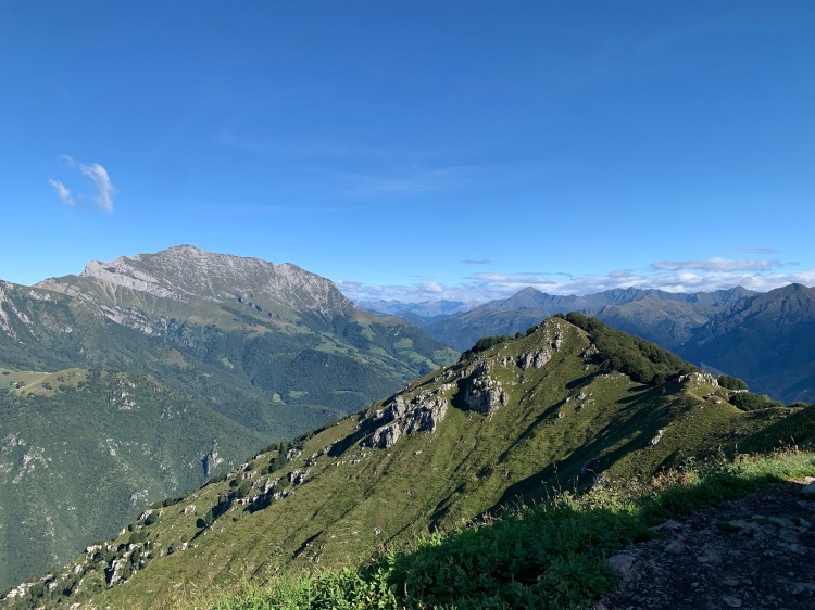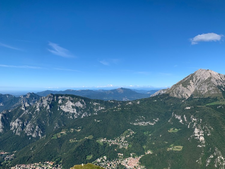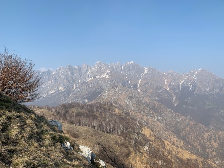 La salita è sempre più “vertical”: in 3km si concentrano 900m di dislivello che ci portano ai 1666m della vetta del Due Mani, caratterizzata da una classica Croce, un bivacco “postmoderno”, e soprattutto da una splendida vista sui monti circostanti, tra cui svettano le Grigne, il Legnone, e il Monte Rosa sullo sfondo.